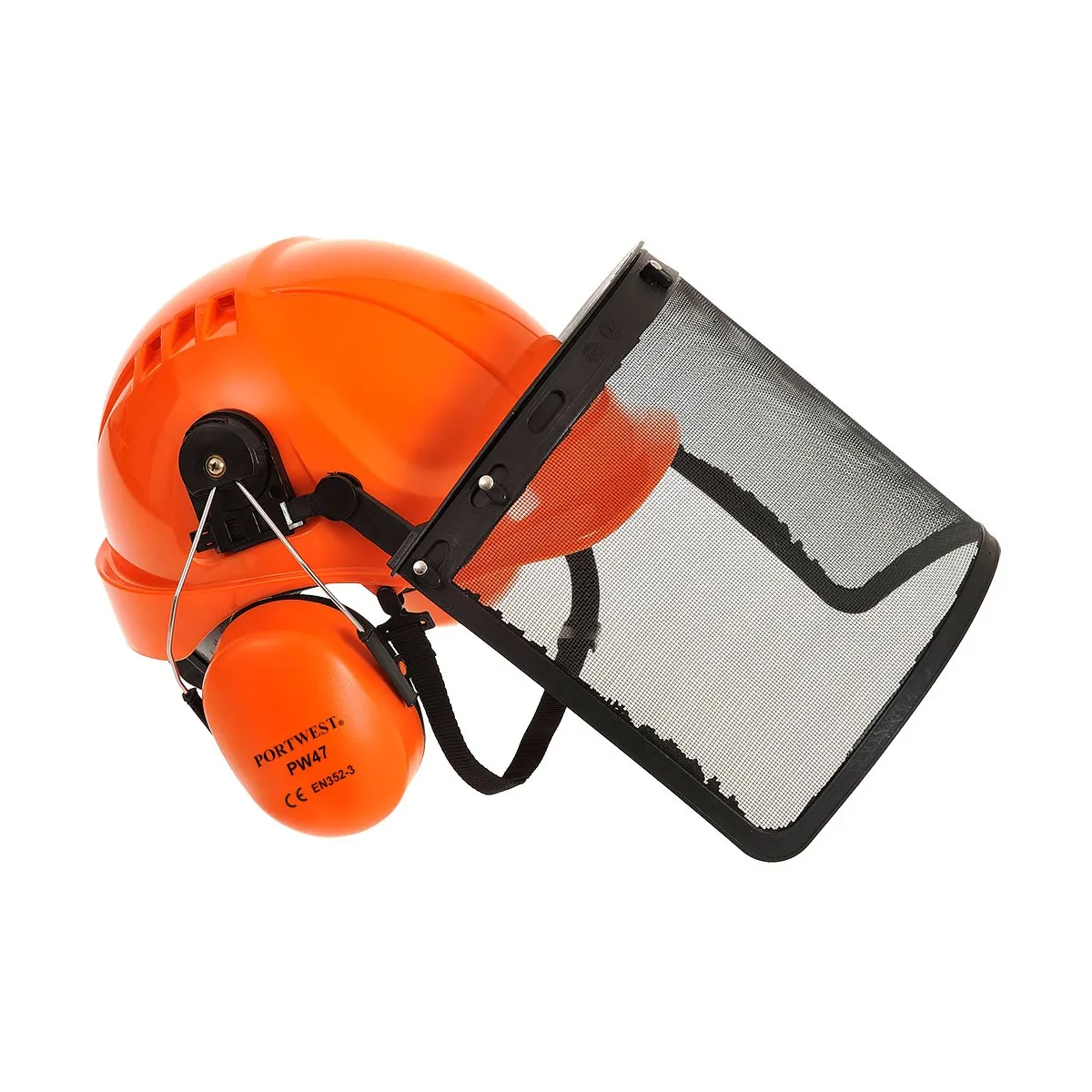 Kit Forestale professionale contenente: -Elmetto di sicurezza ventilato in ABS con regolazione a cremagliera taglia 56-63cm (PS55) - Cuffie antirumore in ABS, regolabili in altezza per una migliore vestibilità (PW47); - Porta-visiera rinforzato e visiera a rete (PS58)