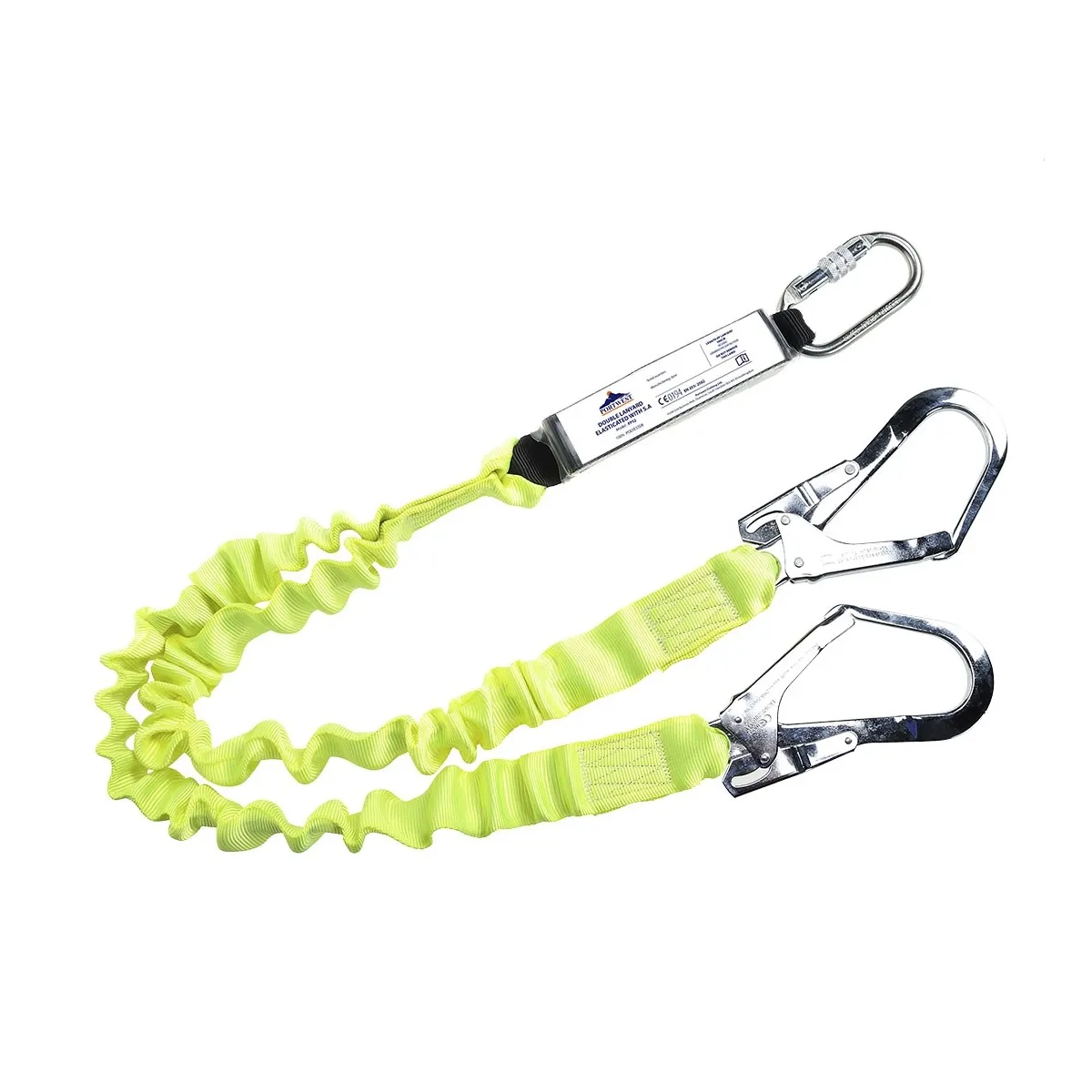 Questo cordino doppio elasticizzato è dotato di un assorbitore di energia, due ganci per ponteggio, un moschettone ed è realizzato in poliestere elasticizzato. E' lungo 180 centimetri inclusi i connettori in posizione completamente estesa