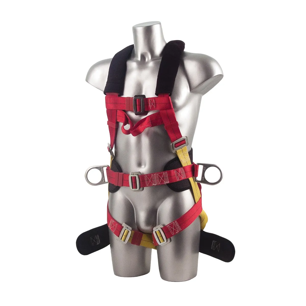 Questa imbracatura incorpora tutte le necessità dell'anticaduta in un solo articolo. Ha due anelli al petto, due anelli D ai lati, anello D posteriore, due anelli su seduta e parte bassa della schiena. Con regolazione spalle, schiena e seduta imbottita.