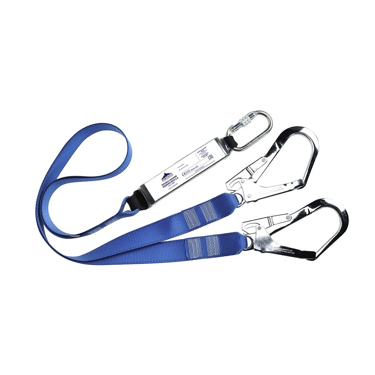 Cordino doppio con cinghie di alta qualità, ganci, moschettone e assorbitore di energia. E 'lungo 180 centimetri inclusi i connettori.